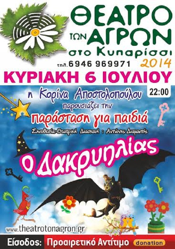 Μια δροσερή θεατρική πρόταση για τους μικρούς φίλους του Θεάτρου των Αγρών που έχει ετοιμάσει με πολύ μεράκι η Κορίνα Αποστολοπούλου και σίγουρα ο «Δακρυηλίας» θα διασκεδάσει τους μικρούς αλλά και τους μεγάλους που θα ανηφορίσουν μέχρι το Κυπαρίσσι.