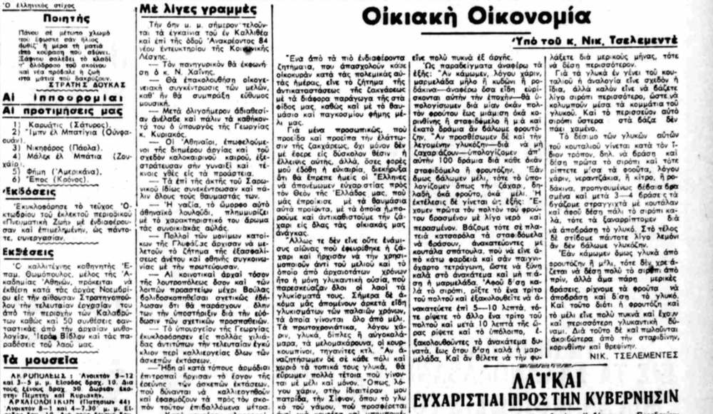 Ο διάσημος Έλληνας αρχιμάγειρας του 20ού αιώνα, Νίκος Τσελεμεντές, γράφει στο άρθρο του με τίτλο «Οικιακή Οικονομία» στο «Έθνος», για τον τρόπο με τον οποίο οι Έλληνες «κατά τας πολεμικάς αυτάς ημέρας» θα αντικαταστήσουν τη ζάχαρη, η οποία θα αρχίζει να εκλείπει από την αγορά, με το μέλι. Την περίοδο της κατοχής, μάλιστα, θα εξαφανιστεί πλήρως και στη θέση της θα μπουν σταφίδες και σύκα.