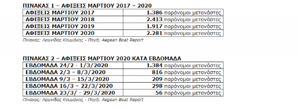 Το 2020 ο συνήθης ρυθμός των αφίξεων παράνομων μεταναστών συνεχίστηκε κανονικά αλλά επιβραδύνθηκε σημαντικά μόνο τις τελευταίες εβδομάδες του μηνός Μαρτίου 2020, όπως φαίνεται από τους παρακάτω πίνακες 1 και 2: