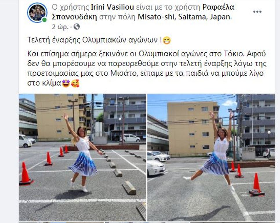 Η Ειρήνη Βασιλείου απολαμβάνει τη συμμετοχή της στους Ολυμπιακούς Αγώνες του Τόκιο, χορεύοντας στο δρόμο με τη συναθλήτρια της, Ραφαέλα Σπανουδάκη και με φόντο συναθλητές της και την Ελληνική σημαία. Η Ηρακλειώτισσα πρωταθλήτρια των 400 μέτρων έκανε με αλλα μέλη της Εθνικής στίβου τη δική της τελετή έναρξης, καθώς στην κανονική λόγω κορωνοϊού δε θα παρευρεθεί.