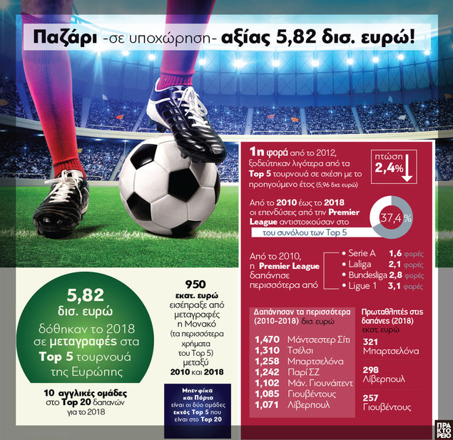 Για πρώτη φορά από το 2012, το συνολικό ποσό που καταβλήθηκε για μεταγραφές από τα μεγάλα κορυφαία πρωταθλήματα της Ευρώπης ήταν λιγότερα από ό,τι για το προηγούμενο έτος, όπως αναφέρει το CIES, διεθνές Κέντρο Αθλητικών Σπουδών, που βρίσκεται στην Ελβετία και δημιουργήθηκε το 1995 ως κοινοπραξία της FIFA με το Πανεπιστήμιο του Νοσατέλ σε σχετική μελέτη από το 2010 έως και το 2018.