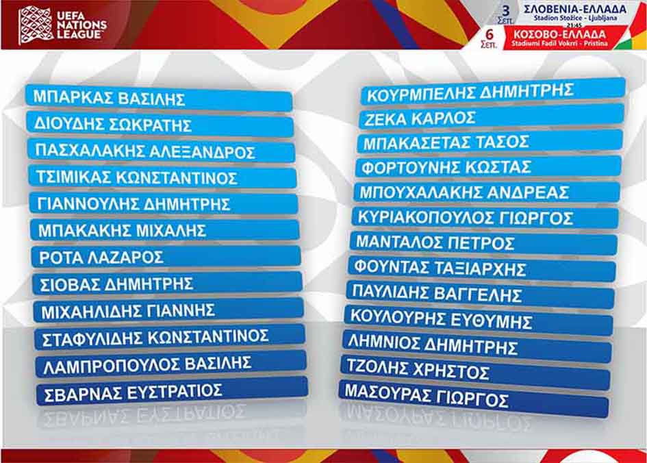 Η αποστολή της Εθνικής ομάδας συγκεντρώνεται -ενόψει των δύο αναμετρήσεων- την προσεχή Δευτέρα (31/08) και την συγκροτούν οι: