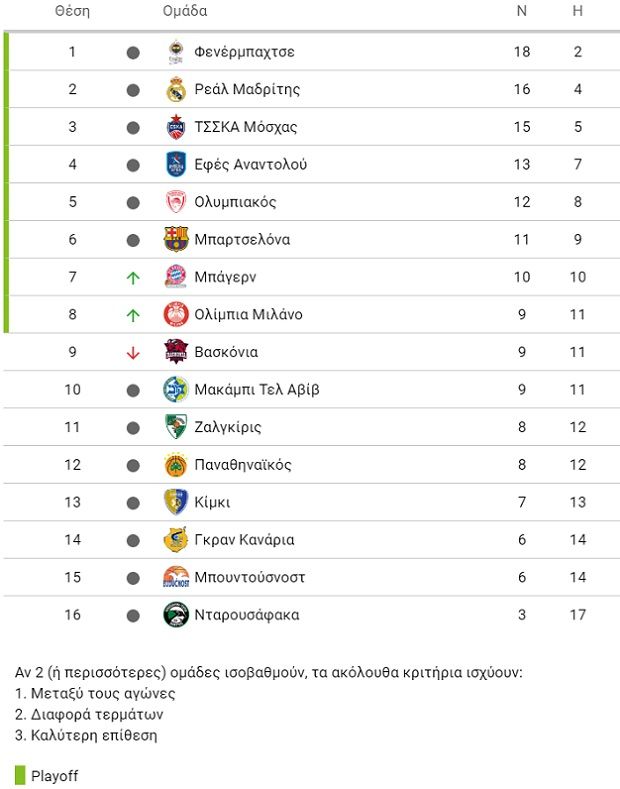 Το δεύτερο.. πιάτο της 20ής αγωνιστικής της EuroLeague δεν άλλαξε την κατάταξη των δύο ελληνικών ομάδων. Η Χίμκι γνώρισε εντός έδρας ήττα από την Μπάγερν, με συνέπεια να μην μπορέσει να ρίξει τον Παναθηναϊκό από την 12η θέση. Ο Ολυμπιακός, από την άλλη, μάλλον χαμογέλασε μετά το "διπλό" της ΤΣΣΚΑ στην Βαρκελώνη, όπου νίκησε την ομάδα του Σβέτισλαβ Πέσιτς και την εμπόδισε από το να πιάσει τους "ερυθρόλευκους", οι οποίοι παρέμειναν έτσι μόνοι τους στην 5η θέση.