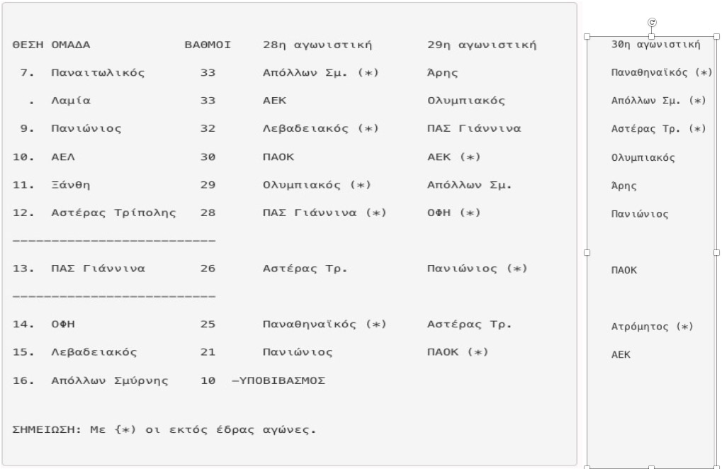 Ουσιαστικά, από την 7η θέση, όπου βρίσκονται Παναιτωλικός και Λαμία ως ισόβαθμοι, μέχρι την 15η θέση, όπου βρίσκεται ο Λεβαδειακός, τα πάντα μπορεί να συμβούν. Μόνο ο ουραγός Απόλλων Σμύρνης έχει οριστικά υποβιβαστεί.