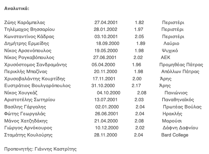 Ο τεχνικός της ομάδας Γιάννης Καστρίτης μαζί με τους συνεργάτες του έκανε την προεπιλογή και έτσι οι παρακάτω αθλητές καλούνται να βρίσκονται την Δευτέρα 27 Μαϊου στις 17.15 στο προπονητήριο του ΟΑΚΑ για την πρώτη συνάντηση.
