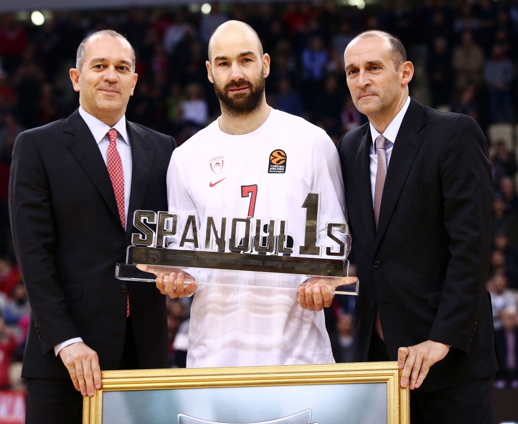 Πριν το τζάμπολ, οι ιδιοκτήτες και πρόεδροι της ΚΑΕ Ολυμπιακός, αδελφοί Αγγελόπουλοι (Παναγιώτης και Γιώργος) βράβευσαν τον αρχηγό των «ερυθρόλευκων» για την ανάδειξή του σε πρώτο σκόρερ, πρώτου σε ασίστ και πρώτου σε βαθμολογία στο σύστημα αξιολόγησης όλων των εποχών στη Euroleague. Συγκινημένος, ο “ Kill-Bill” παρέλαβε το βραβείο που ήταν μια το όνομά του γραμμένο στα λατινικά, αλλά στη θέση του I (Spanoulis) υπάρχει ένα τεράστιο νούμερο «1» που προεξείχε από τα υπόλοιπα γράμματα.