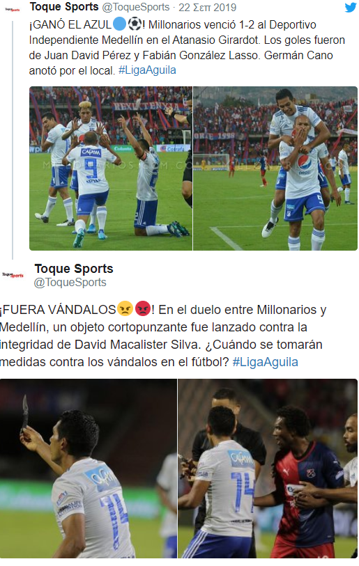 Η Μιγιονάριος επικράτησε 2-1 της Μεντεγίν εκτός έδρας, αλλά το παιχνίδι αυτό για το πρωτάθλημα της Κολομβίας στιγματίστηκε από το σοκ που προκλήθηκε με το μαχαίρι που πέταξε οπαδός των γηπεδούχων προς τον Νταβίντ Μακάλιστερ Σίλβα των φιλοξενούμενων κατά την διάρκεια των πανηγυρισμών του!