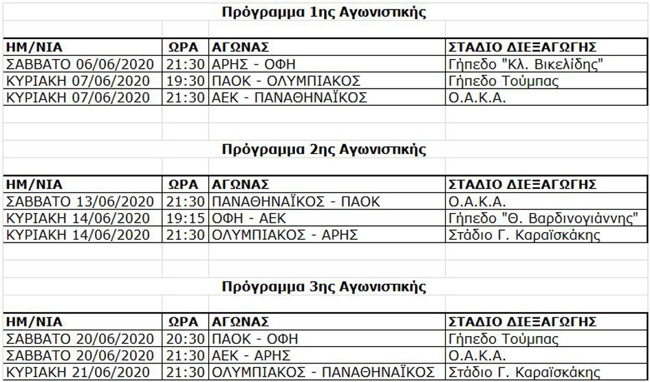 Την Κυριακή 7 Ιουνίου στις 19:30 θα διεξαχθεί το ΠΑΟΚ - Ολυμπιακός και στις 21:30 το ΑΕΚ - Παναθηναϊκός. Την Κυριακή 14/6 θα γίνει το Ολυμπιακός - Άρης, ενώ το Παναθηναϊκός - ΠΑΟΚ θα διεξαχθεί το Σάββατο 13 Ιουνίου.
