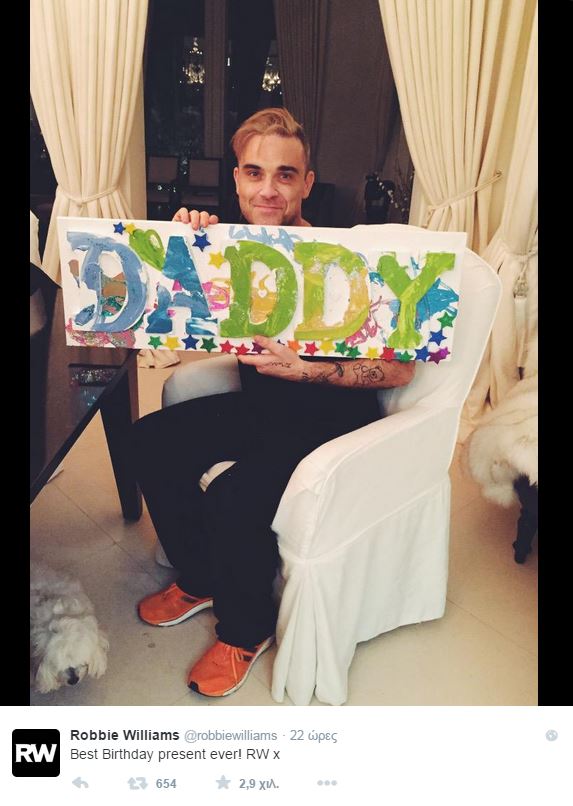 Το καλύτερο δώρο γενεθλίων έλαβε ο δημοφιλής τραγουδιστής το οποίο είναι ανεκτίμητης αξίας. Μη σας πάει το μυαλό σε ακριβό σπίτι ούτε σε σπορ αυτοκίνητο. Το δώρο ήταν από τη δύο χρονών κορούλα του Ρόμπι Γουίλιαμς και με μία φωτογραφία που δημοσίευσε στο Twitter το έκανε γνωστό στους διαδικτυακούς του φίλους.