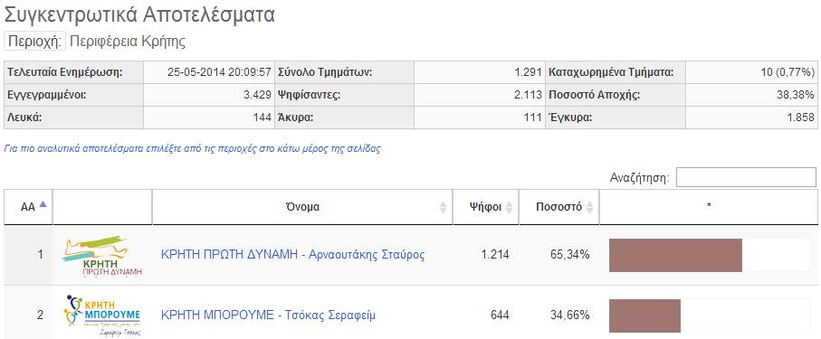 Πρώτο επίσημο αποτέλεσμα στην Περιφέρεια Κρήτης σε 9 εκλογικά τμήματα επί συνόλου 1291 τμημάτων: