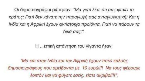Αμίμητο σκηνικό διαλόγου το πρωί σε τηλεοπτική εκπομπή. Δύο δημοσιογράφοι πασχίζουν να αποδείξουν πως για .. όλα φταίει η χαμηλή ποιότητα του αγροτικού προϊόντος. Απέναντί τους όμως έχουν έναν αγρότη ... με άποψη και με επιχειρήματα ατράνταχτα. Διαβάστε τον διάλογο όπως αναμεταδόθηκε στο facebook