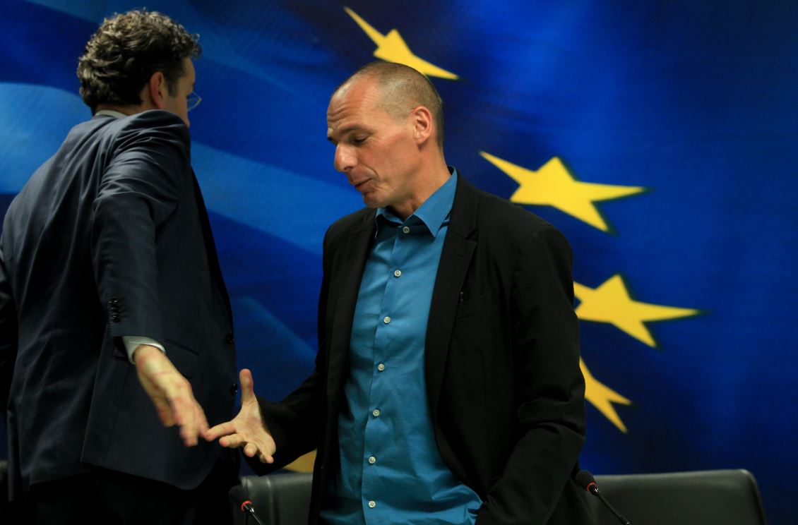 Αμηχανία σήμερα στην συνέντευξη Τύπου που έδωσαν οι Γιάννης Βαρουφάκης και Γερούν Ντάισελμπλουμ. Ο επικεφαλής του Eurogroup έδειξε τη δυσαρέσκεια του μετά τη δήλωση του Έλληνα υπουργού Οικονομικών ότι η κυβέρνηση δεν συνεργάζεται με την τρόικα. Είπε κάτι στον Γιάνη Βαρουφάκη και στην συνέχεια όπως βλέπετε στις φωτογραφίες δεν μπόρεσε να κρύψει την ενόχλησή του και φάνηκε να δίνει με το ζόρι το χέρι στον Έλληνα υπουργό Οικονομικών.
