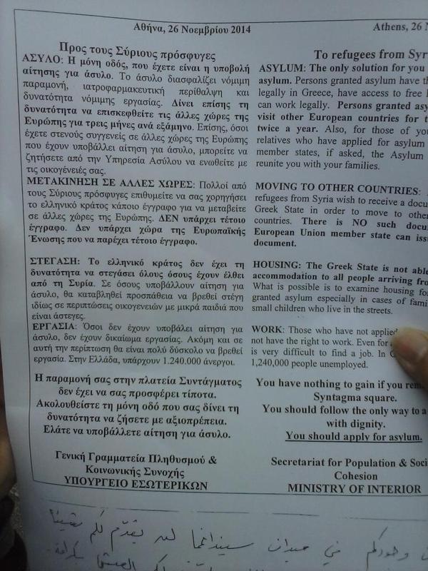 Ω καιροί, ω ήθη! Η Ελλάδα, χώρα που γνώρισε στο πετσί της ξεριζωμούς και προσφυγές μοίραζει σήμερα αυτό το σημείωμα στους εξαντλημένους από την απεργία πείνας πρόσφυγες που κατακλύζουν το Σύνταγμα.