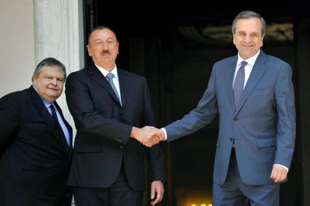 Στη φωτογραφία είναι πρόδηλη η αγωνία ενός ανθρώπου, του Βαγγέλη Βενιζέλου, να είναι στο ίδιο "κάδρο" με τον πρόεδρο του Αζερμπαϊτζάν Ιχμάν Αλίεφ και τον πρωθυπουργό Αντώνη Σαμαρά.