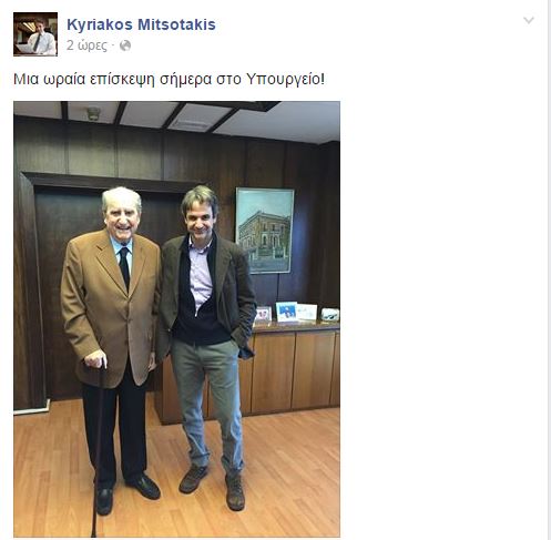 Τον πατέρα του Κωνσταντίνο Μητσοτάκη υποδέχθηκε σήμερα στο γραφείο του, ο υπουργός Διοικητικής Μεταρρύθμισης, Κυριάκος Μητσοτάκης. Μάλιστα ο υπουργός, δεν παρέλειψε να σχολιάσει την επίσκεψη στην προσωπική του σελίδα στο facebook.