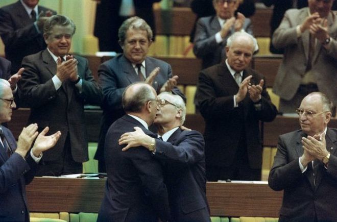 Το στιγμιότυπο είναι από τη χθεσινή αλλαγή ... φρουράς στο Υπουργείο Οικονομικών, όπου ο κ. Γκίκας Χαρδούβελης παραδίδει το χαρτοφυλάκιο στον κ. Γιάννη Βαρουφάκη. Για λόγους αβροφροσύνης οι δύο άντρες αντάλλαξαν και τον τυπικό ασπασμό. Όμως ο φακός του Άρη Μεσσίνη κατέγραψε το στιγμιότυπο από μία γωνία που κάνει το φιλί να θυμίζει τον "θερμό" ασπασμό του Γκορμπατσόφ με τον Χόνεκερ το 1986.