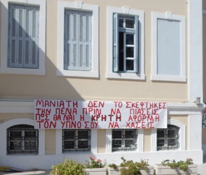 Το Ρέθυμνο σήμερα είπε ¨όχι¨ στην μετατροπή της Κρήτης σε "μπαταρία" από τα "δάση" των ανεμογεννητριών που ξεφυτρώνουν στα βουνά της. Πολυπληθής διαδήλωση έγινε στους κεντρικούς δρόμους της πόλης ενώ στο κτήριο της Περιφέρειας αναρτήθηκαν ευρηματικά πανό με συνθήματα όπως αυτό της φωτογραφίας: