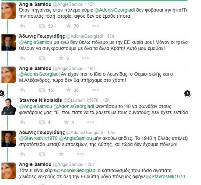 Τα tweets πέφτουν βροχή από το βράδυ της Παρασκευής και μετά την αποχώρηση του Ντάισελμπλουμ από το συνέντευξη τύπου με τον Γιάννη Βαρουφάκη. Ο 'Αδωνις Γεωργιάδης, ο οποίος αρέσκεται να "συνομιλεί" και να απαντά ακόμα και στην πιο σκληρή κριτική, κονταροχτυπιέται με την τραγουδίστρια Αντζυ Σαμίου. Το μέρος της δεύτερης παίρνει και ο ηθοποιός Σταύρος Νικολαϊδης: