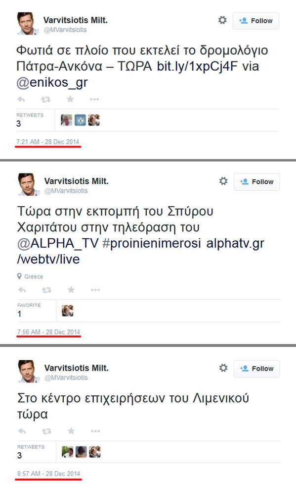 Κυκλοφορεί στο Διαδίκτυο και θυμίζει εν πολλοίς την βραδιά των Ιμίων, όταν ο τότε καθ' ύλην αρμόδιος Υπουργός Θεόδωρος Πάγκαλος, επέλεξε να παραμείνει σε τηλεοπτική εκπομπή μέχρι αργά αντί να ασχοληθεί με τα τρέχοντα και τα φλέγοντα. Την ίδια ακριβώς πολιτική φαίνεται πως ακολούθησε το πρωϊνό της Κυριακής κι ο καθ' ύλην αρμόδιος Έλληνας Υπουργός όταν στα χωρικά ύδατα του τόπου μας ένα πλοίο ειδοποίησε ότι καιγόταν. Ο κ. Βαρβιτσιώτης φρόντισε να "αναμεταδώσει" την είδηση στα social media και εν συνεχεία να ενημερώσει εν είδη ... διαφημιστικού μηνύματος για την επόμενη τηλεοπτική του εμφάνιση. Όταν τελείωσε με τις ... δημόσιες σχέσεις του ενημέρωσε (επίσης από τα social media) ότι οδεύει στο πόστο του, στο Υπουργείο για να χειριστεί το θέμα. Μόνο που από πλευράς προτεραιοτήτων το έθεσε μετά την ... τηλεοπτική του εμφάνιση. Για να ακριβολογούμε του πήρε περίπου δύο ώρες, να αποφασίσει πως ήταν ώρα να μεταβεί στον Θάλαμο επιχειρήσεων του Υπουργείου.