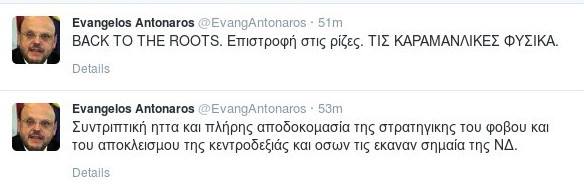 «Συντριπτική ήττα και πλήρης αποδοκιμασία της στρατηγικής του φόβου και του αποκλεισμού της κεντροδεξιάς και όσων τις έκαναν σημαία της ΝΔ». Μάλιστα στη συνέχεια ανέβασε νέο σχόλιο υποστηρίζοντας πως η ΝΔ πρέπει να επιστρέψει στις καραμανλικές της ρίζες. «BACK TO THE ROOTS. Επιστροφή στις ρίζες. ΤΙΣ ΚΑΡΑΜΑΝΛΙΚΕΣ ΦΥΣΙΚΑ».