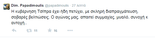 «Η κυβέρνηση Τσίπρα έχει ήδη πετύχει, με σκληρή διαπραγμάτευση, σοβαρές βελτιώσεις. Ο αγώνας μας απαιτεί συμμαχίες, μυαλό, συνοχή και αντοχή..», αναφέρει ο κ. Παπαδημούλης σε ανάρτησή του στο twitter.