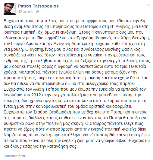 "Ο Σταύρος πάντα έλεγε πως πρέπει να ξέρεις πότε να αποσύρεσαι από την πολιτική", γράφει ο Πέτρος Τατσόπουλος στο facebook ανακοινώνοντας ότι αποσύρεται από την ενεργό πολιτική και επιστρέφει στην συγγραφή. Υπενθυμίζουμε ότι ο κ. Τατσόπουλος που ήταν υποψήφιος με το "Ποτάμι" δεν κατάφερε να εκλεγεί.