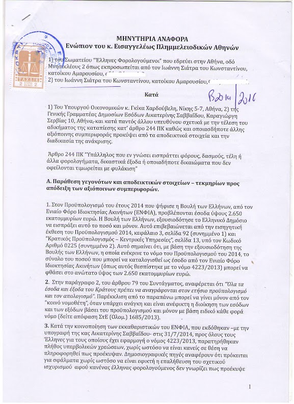 Μηνυτήρια αναφορά κατά του υπουργού Οικονομικών Γκίκα Χαρδούβελη και της Γενικής Γραμματέως Δημοσίων Εσόδων Κατερίνας Σαββαΐδου κατέθεσε χθες Τετάρτη προς τον Εισαγγελέα Πλημμελειοδικών Αθηνών το Σωματείο «Έλληνες Φορολογούμενοι» σχετικά με την τέλεση του αδικήματος της «καταπίεσης» του Ποινικού Κώδικα.