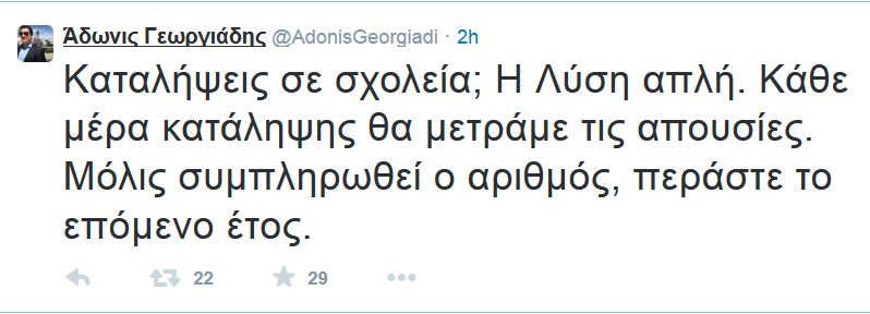 "Καταλήψεις σε σχολεία; Η Λύση απλή. Κάθε μέρα κατάληψης θα μετράμε τις απουσίες. Μόλις συμπληρωθεί ο αριθμός, περάστε το επόμενο έτος" έγραψε στο Twitter, αναφέρει το enikos.