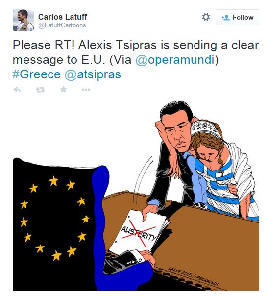 Η Ελλάδα ψυχορραγεί και μετά βίας περπατάει, υποβασταζόμενη από τον Αλέξη Τσίπρα, ενώπιον ενός ευρωπαίου αξιωματούχου. Ο Ελληνας πρωθυπουργός δίνει στον ευρωπαίο χαρτί στο οποίο αναγράφεται σβησμένη με ένα Χ η λέξη λιτότητα. Το σκίτσο ανήκει στον Carlos Latuff γνωστό για τα σκίτσα του για την ισραηλινο-παλαιστινιακή διένεξη και κυκλοφόρησε την ώρα που βρισκόταν σε εξέλιξη η συνεδρίαση του Eurogroup στις Βρυξέλλες.