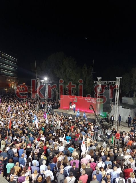 Απευθυνόμενος στον "δημοκρατικό λαό της Κρήτης", ο πρωθυπουργός και πρόεδρος του ΣΥΡΙΖΑ, Αλέξης Τσίπρας σχολίασε τη συμμετοχή του κόσμου στην πλατεία Ελευθερίας του Ηρακλείου λέγοντας ότι "η σημερινή συγκλονιστική παρουσία τους είναι παρουσία βγαλμένη από άλλες δεκαετίες, που θυμίζει τη δεκαετία του ‘80 και είναι μήνυμα, το εισιτήριο νίκης".