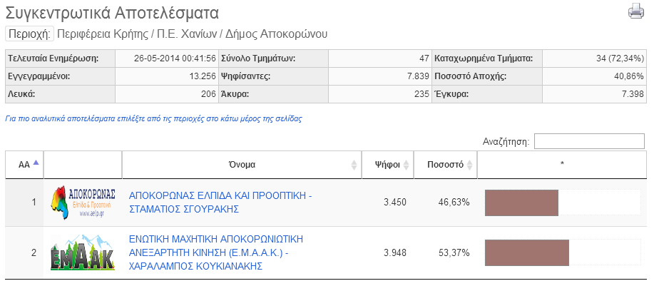 Σε 34 από τα 47 εκλογικά τμήματα τα επίσημα αποτελέσματα για τον Δήμο Αποκορώνου