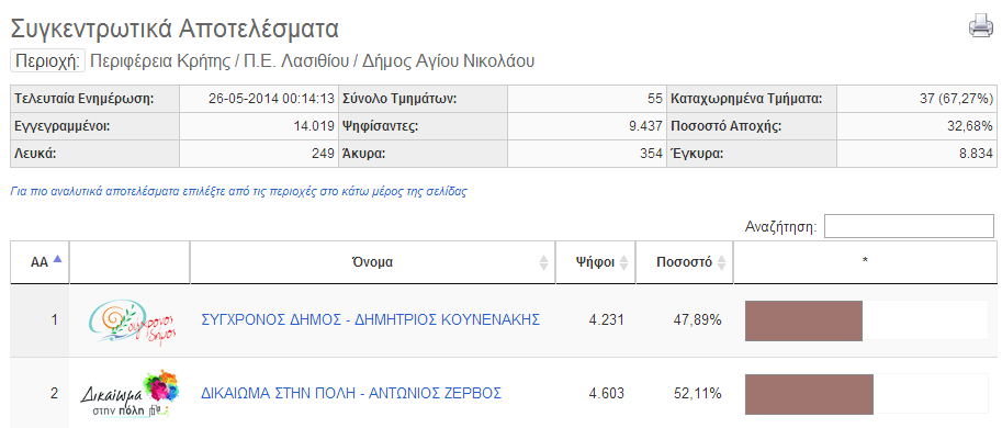Σε 37 από τα 55 εκλογικά τμήματα τα επίσημα αποτελέσματα του δήμου Αγίου Νικολάου