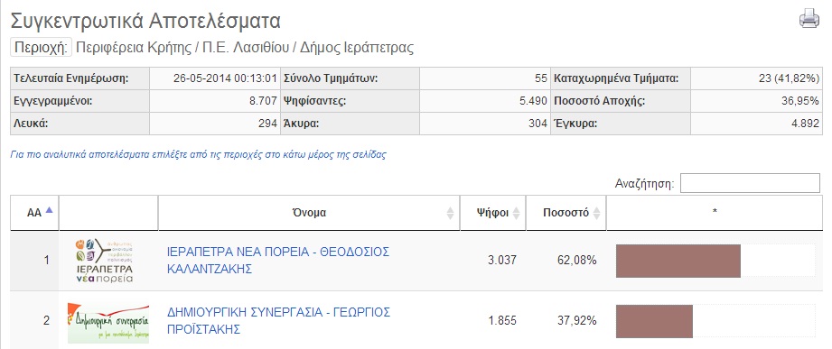 Σε 23 από τα 55 εκλογικά τμήματα τα επίσημα αποτελέσματα για το δήμο Ιεράπετρας