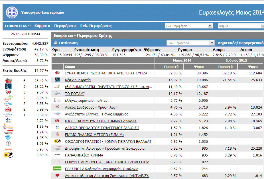 Αποτελέσματα Ευρωεκλογών στη Περιφέρεια Κρήτης με ενσωματωμένο το 38,30%