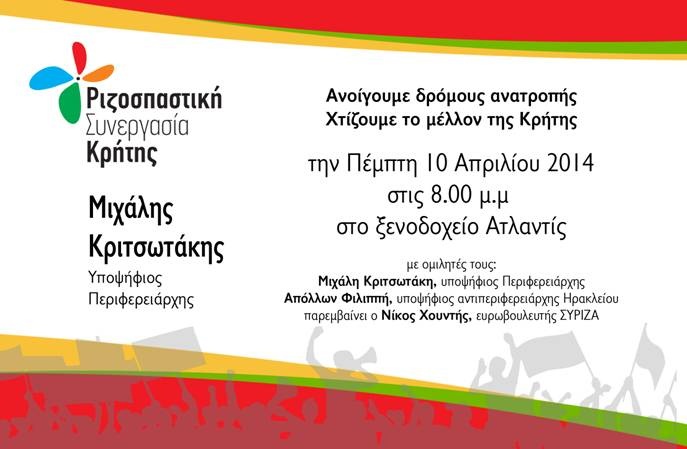 Πολιτική εκδήλωση με θέμα: "Ανοίγουμε δρόμους ανατροπής. Χτίζουμε το μέλλον της Κρήτης" οργανώνει ο συνδυασμός "Ριζοσπαστική Συνεργασία Κρήτης" με επικεφαλής τον Μιχάλη Κριτωτάκη. Ομιλητές θα είναι ο ίδιος ο υποψήφιος Περιφερειάρχης, ο υποψήφιος αντιπεριφερειάρχης Ηρακλείου Απόλλων Φιλιππής και ο Ευρωβουλευτής του ΣΥΡΙΖΑ Νίκος Χουντής.