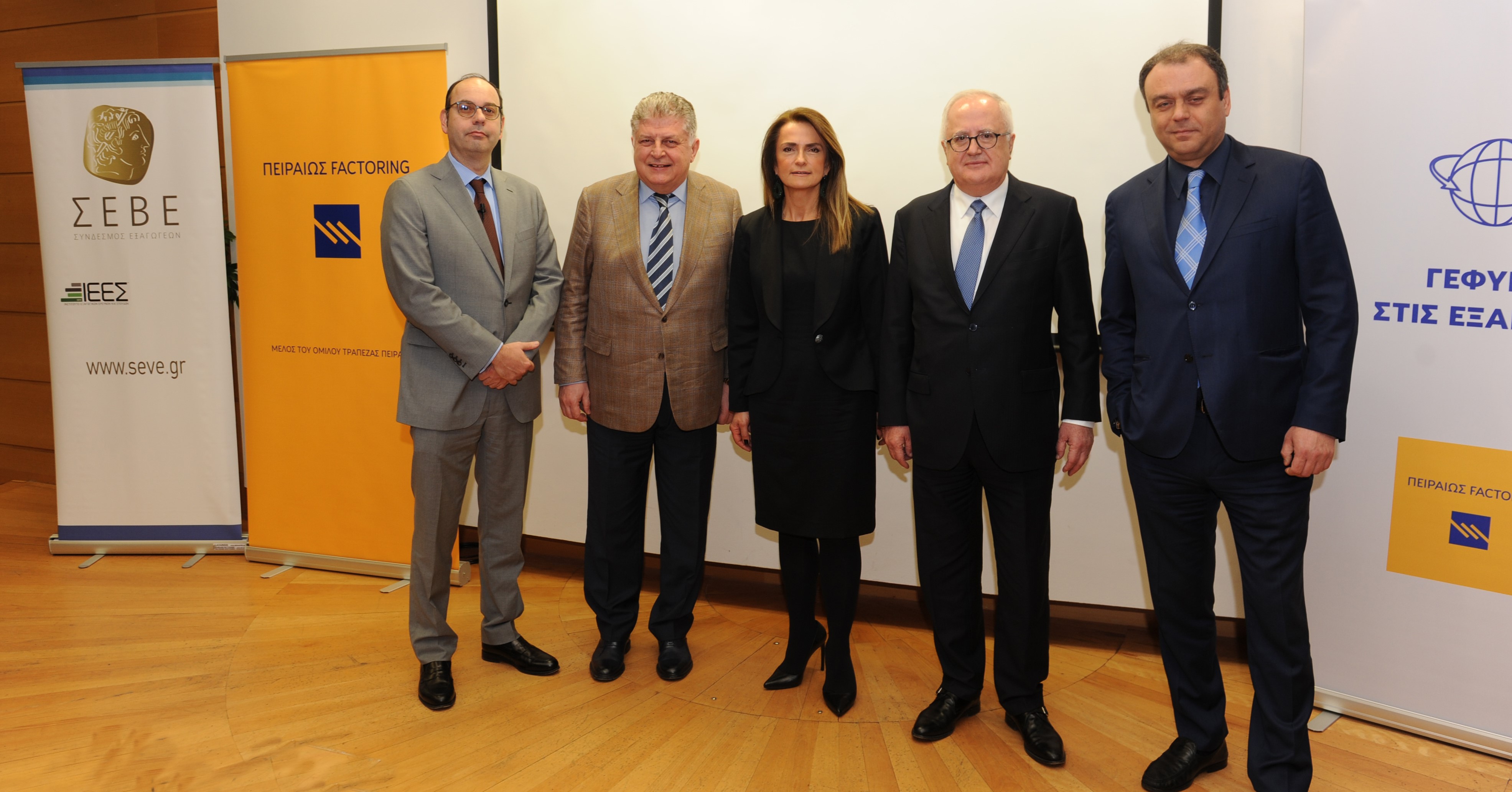 Από αριστερά: Ηλίας Λεκκός, Chief Economist του Ομίλου της Τράπεζας Πειραιώς, Γιώργος Κωνσταντόπουλος Πρόεδρος του ΣΕΒΕ, Χαρά Βαρδακάρη, Διευθύνουσα Σύμβουλος της Πειραιώς Factoring, Γιώργος Χαντζηνικολάου, Πρόεδρος της Τράπεζας Πειραιώς, Παναγιώτης Χασάπης Εκτελεστικός Αντιπρόεδρος του ΣΕΒΕ
