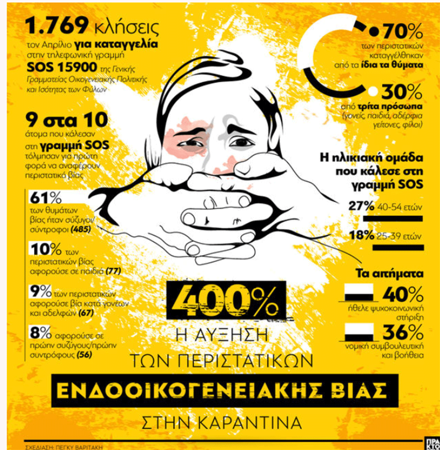 Σύμφωνα με τα στοιχεία από την τηλεφωνική γραμμής SOS 15900, καταγράφηκε αύξηση των περιστατικών ενδοοικογενειακής βίας στην Ελλάδα, κατά τη διάρκεια της καραντίνας, κατά 400%.