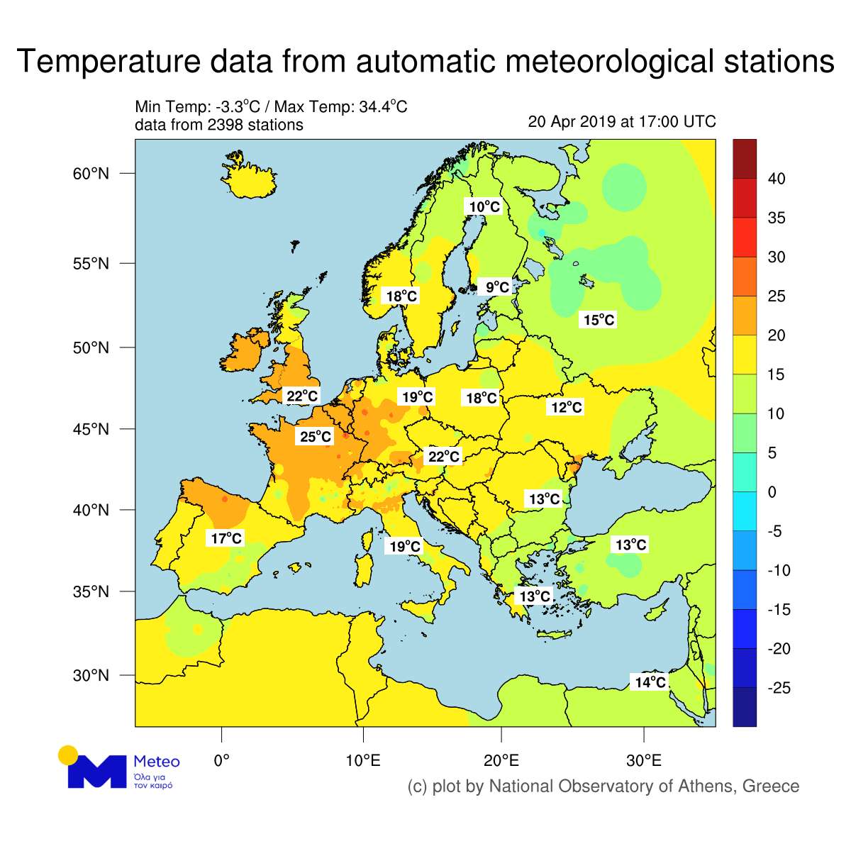 Η χώρα μας το Σάββατο 20 Απριλίου 2019 αποτέλεσε μια από τις πιο κρύες γωνιές της Ευρώπης, με τη θερμοκρασία να είναι χαμηλότερη μόνο στη Σκανδιναβία. Η θερμοκρασία στο Παρίσι ξεπέρασε τους 26°C και τους 24°C στο Λονδίνο, ενώ στην Αθήνα η μέγιστη τιμή της έφτασε μόλις τους 17°C. Από τη Μεγάλη Δευτέρα όμως το σκηνικό του καιρού αλλάζει, με θερμές αέριες μάζες να πλησιάζουν τη χώρα μας από την Αφρική, ανεβάζοντας τη θερμοκρασία μέχρι το τέλος της Μεγάλης εβδομάδας περίπου 10°C σε σχέση με το Σάββατο 20/04, με τον υδράργυρο να πλησιάζει τους 30ºC στα νοτιότερα τμήματα.