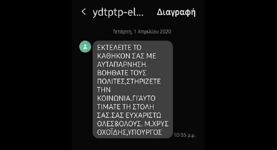 «Εκτελείτε το καθήκον σας με αυταπάρνηση. Βοηθάτε τους πολίτες, στηρίζετε την κοινωνία. Γι’ αυτό τιμάτε τη στολή σας. Σας ευχαριστώ όλες και όλους. Μιχάλης Χρυσοχοΐδης, υπουργός», έγραφε το μήνυμα που απεστάλη με εντολή του υπουργού Προστασίας του Πολίτη.