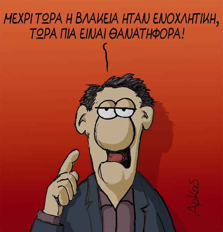 Στο πρώτο καταφέρεται με το χιούμορ του στου ανεύθυνους που συνεχίζουν να κυκλοφορούν αμέριμνοι για τις συνέπειες και γράφει: Μέχρι τώρα η βλακεία ήταν ανίκητη, τώρα είναι θανατηφόρα.