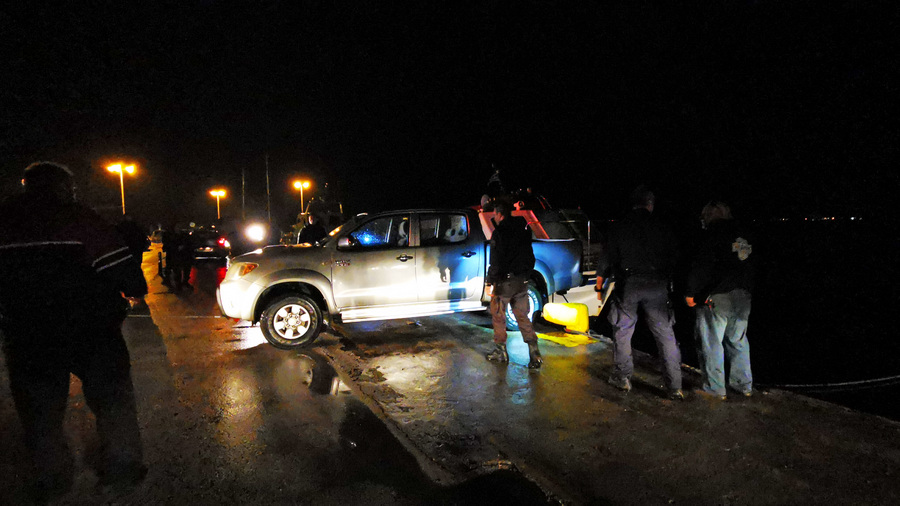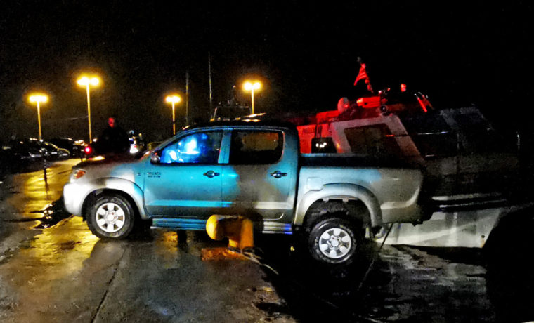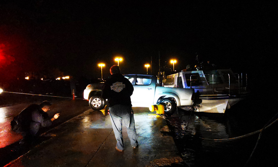 Το αγροτικού τύπου 4χ4 όχημα, έσωσαν από την πτώση στη θάλασσα, τα σχοινιά ενός θαλάσσιου ταξί που βρισκόταν ακριβώς στο σημείο που κατέληξε το αυτοκίνητο λίγο πριν πέσει στο νερό.