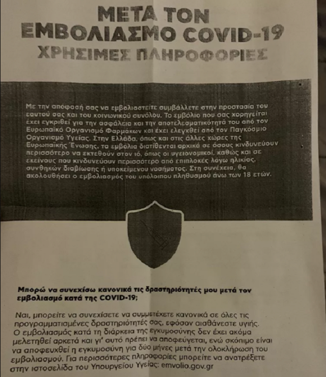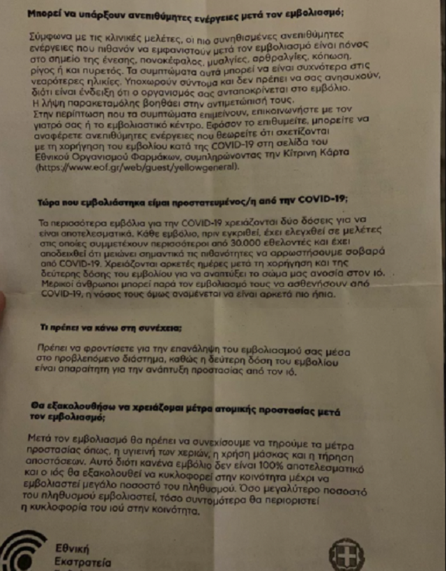 Πληροφορίες αναφορικά με το εμβόλιο του κορωνοϊού, αλλά και τις ανεπιθύμητες ενέργειες που μπορείνα έχει, παρέχονται στους εμβολιασθέντες με ενημερωτικό έντυπο που δίνεται μετά την ένεση.
