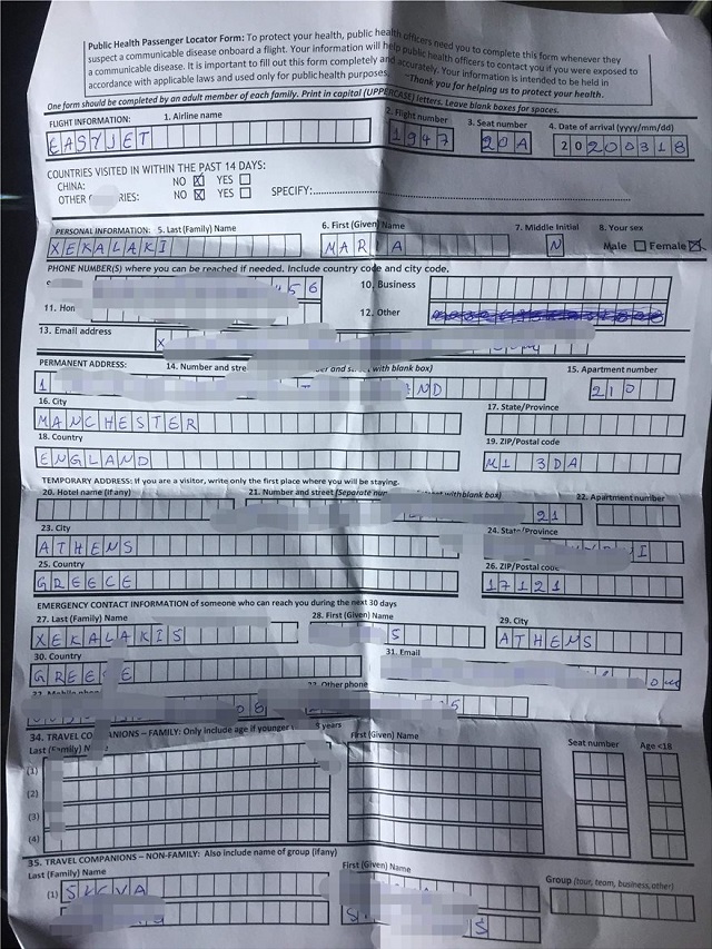 Την πρόσφατη αυστηρή οδηγία των ελληνικών Αρχών, να συμπληρώνουν όλοι οι ταξιδιώτες που έρχονται από το Ηνωμένο Βασίλειο μια φόρμα που θα περιλαμβάνει τα στοιχεία της πτήσης, τα δικά τους, τους λόγους του ταξιδιού, αν είναι δηλαδή Έλληνες, τουρίστες ή έρχονται για επαγγελματικούς λόγους και κυρίως το σημείο-τόπο διαμονής τους για τις 14 μέρες της υποχρεωτικής τους απομόνωσής, φαίνεται να μην ακολούθησε σωστά σύμφωνα με το ptotothema, το προσωπικό της εταιρείας Easy Jet στην πτήση EZY 1947 από Μάντσεστερ προς Αθήνα που αφίχθη χθες 13.35.