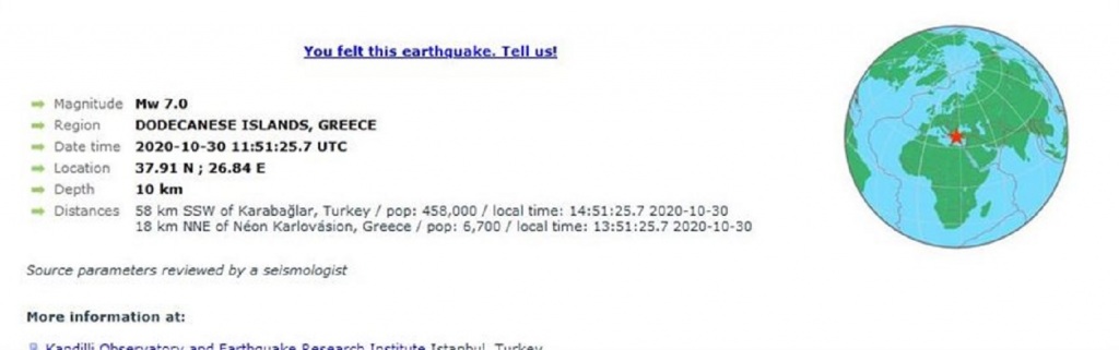 Το Αμερικανικό Γεωδυναμικό Ινστιτούτο συμβαδίζει με το Ευρωμεσογειακό Ινστιτούτο και δίνει ένταση σεισμού τα 7.0 Ρίχτερ με επίκεντρο την Ανατολική Τουρκία.