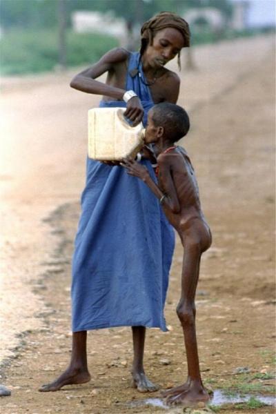 Μια από τις φωτογραφίες του Γιάννη Μπεχράκη, η οποία έγραψε τη δική της ιστορία, είναι αυτή με μια μητέρα από τη Σομαλία που δίνει νερό από ένα μπιτόνι στο σκελετωμένο της παιδί.