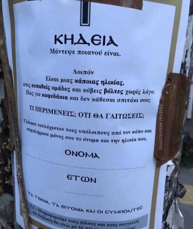 Τις τελευταίες μέρες, σε δρόμους κοντά στο Δημαρχείο του Αγίου Δημητρίου Αττικής, μπορεί να δει κανείς μπροστά του αφίσες – κηδειόχαρτα με τη σημείωση: