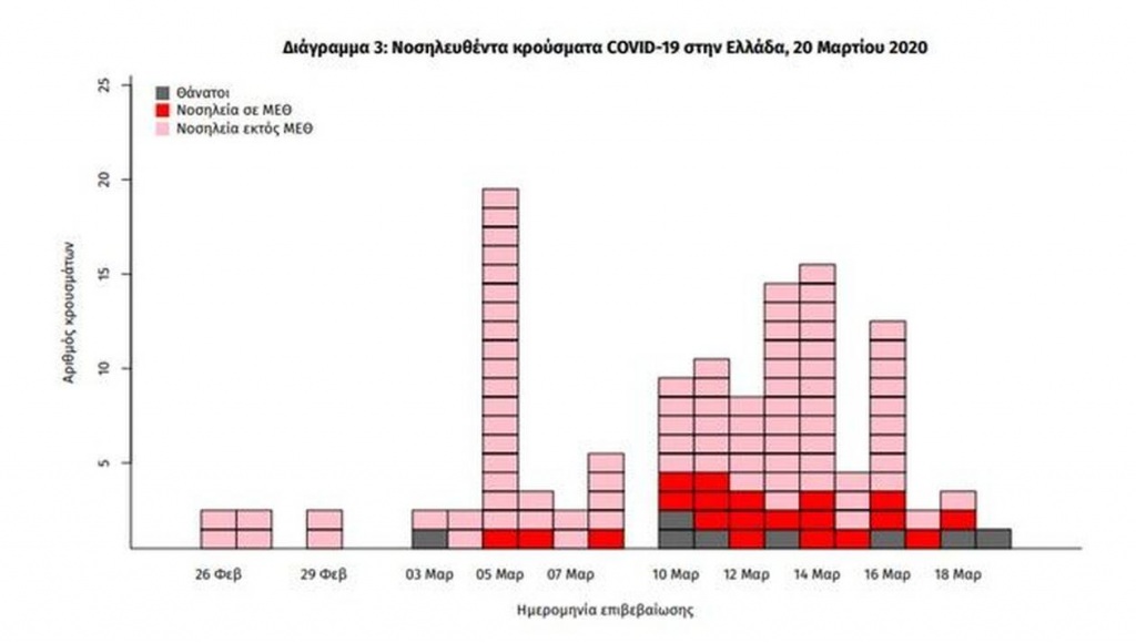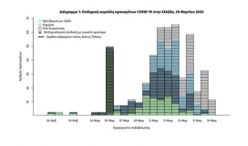 Η πορεία εξάπλωσης του Covid-19 και το «προφίλ» των ασθενών παρουσιάζονται μεταξύ άλλων στην επιδημιολογική επιτήρηση της λοίμωξης από το κορονοϊό στην Ελλάδα, την οποία έδωσε στη δημοσιότητα ο Εθνικός Οργανισμός Δημόσιας Υγείας (ΕΟΔΥ). Η έκθεση αφορά τα επίσημα στοιχεία που έχουν συλλεχθεί μέχρι τις 20 Μαρτίου 2020 και ώρα 15:00.