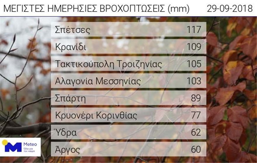 Στις Σπέτσες η βροχή έφτασε τα 117 χιλιοστά, σύμφωνα με την μέτρηση του τοπικού σταθμού στις 17:40, ενώ λίγο βορειότερα, στο Κρανίδι, το ύψος της βροχής αγγίζει τα 111 χιλιοστόμετρα.