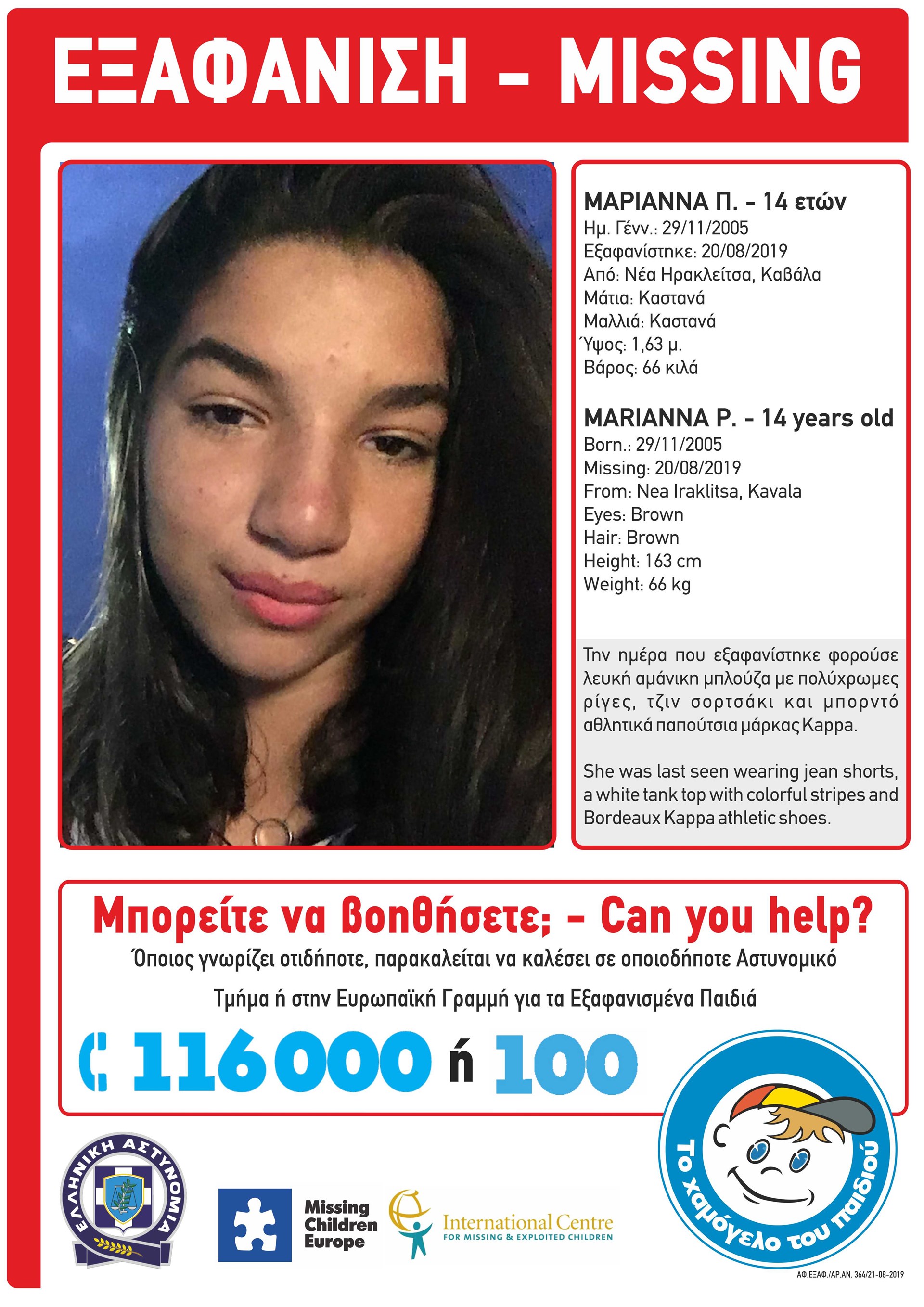 Συναγερμός έχει σημάνει στις Αρχές μετά την εξαφάνιση της 14χρονης Μαριάννας Π. από την Νέα Ηρακλείτσα Καβάλας. Σύμφωνα με ανακοίνωση του Χαμόγελο του Παιδιού, η 14χρονη εξαφανίστηκε στις 20 Αυγούστου και ώρα 12:05.