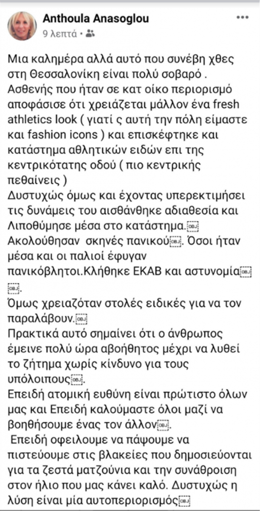 Ασθενής που ήταν σε κατ'οίκον περιορισμό επισκέφθηκε αργά το απόγευμα της Παρασκευής κατάστημα αθλητικών ειδών επί της Τσιμισκή στη Θεσσαλονίκη, αισθάνθηκε αδιαθεσία και λιποθύμησε μέσα στο κατάστημα.